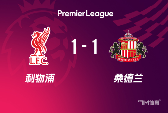 下半场伤停补时7分钟,全场比赛结束,最终利物浦1-1桑德兰。