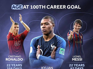 欧洲杯预选赛H组,法国对阵安道尔。比赛第11分钟,恩东贝莱后场抢断,给到中路的格列兹曼,格列兹曼分球给姆巴佩,姆巴佩前场左侧前插,随后杀入禁区挑射入网!法国1-0领先安道尔!据数据统计,这粒进球是姆巴佩职业生涯第100粒进球(俱乐部87球+国家队13球)!达成百球里程碑时,姆巴佩为20岁173天,梅西为22岁97天,C罗为22岁356天。 ……