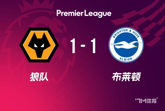 下半场伤停补时5分钟,全场比赛结束,最终狼队1-1布莱顿。