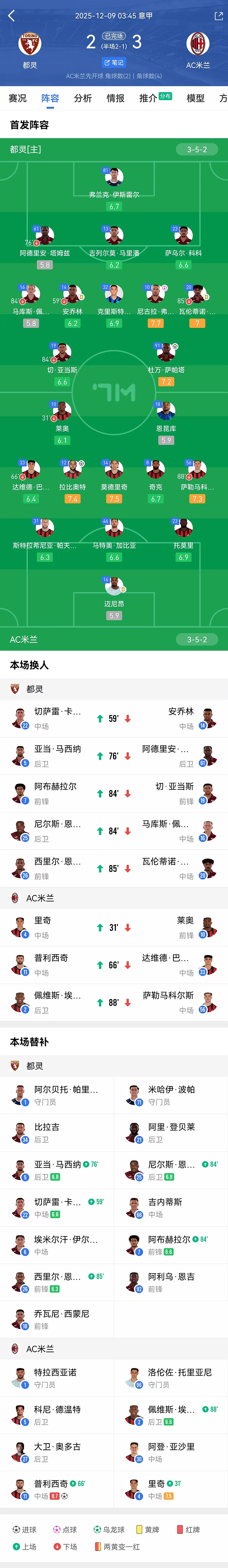 米兰首发:16-迈尼昂、23-托莫里、31-帕夫洛维奇、33-巴特萨基(66'' 11-普利西奇)、46-加比亚、8-奇克、12-拉比奥特、14-莫德里奇、10-莱奥(31'' 4-里奇)、18-恩昆库、56-萨勒马科尔斯(88'' 2-埃斯图皮尼安)