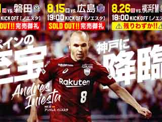 据J1俱乐部神户胜利船官网消息,受前巴萨队长伊涅斯塔于今夏加盟神户胜利船的影响,将于本月15日进行的对阵领头羊广岛三箭的主场球票已经提前售罄。值得一提的是,这也是涉及神户胜利船比赛的球票连续四场全部卖光,而这四场比赛分别为:本月1日客场1-1战平大阪樱花、5日客场0-1不敌东京FC、11日即将到来的主场对阵磐田喜悦、以及15日主场对阵广岛三箭。此外,神户胜利 ……